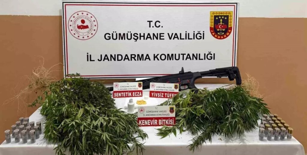 Gümüşhane Vilayet Jandarma Komutanlığı gruplarının düzenlediği 2 farklı operasyonda geçersiz içki imalinde kullanılan etil alkol, ekili kenevir, sentetik ecza ve ruhsatsız silah ele geçirildi. Olaylarla ilgili iki kuşkulu hakkında isimli tahkikat başlatıldı.